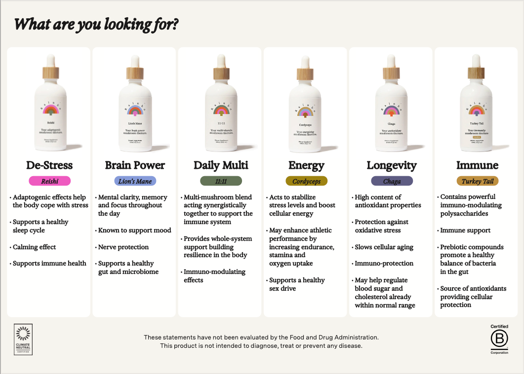 No grain. No fillers. No mycelium in our products. Just mushrooms with you and Mother Earth in mind.