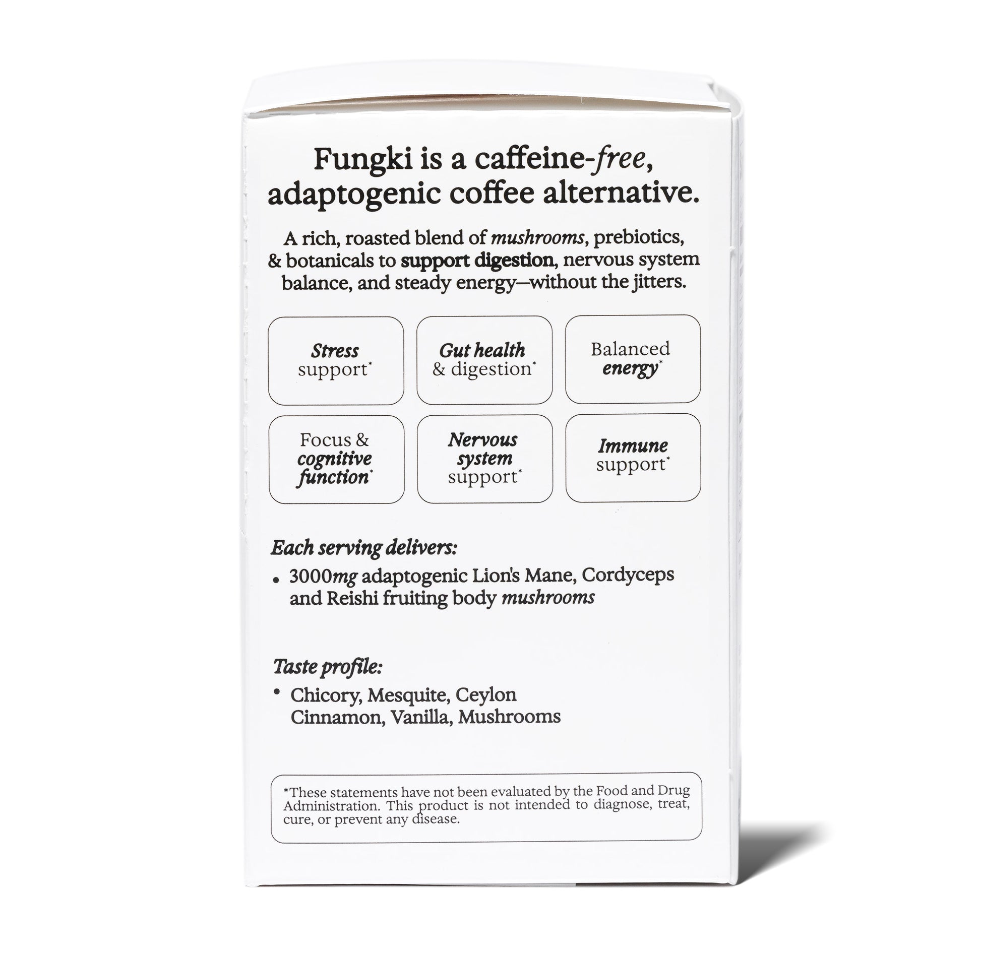 - Fungki is your caffeine-free coffee alternative, made with functional mushrooms, prebiotic herbs, and spices for grounded energy without the jitters. It features Lion’s Mane, Reishi, Cordyceps, chicory, mesquite, vanilla, cinnamon, and Himalayan salt, giving it a rich and roasted flavour profile of its own.