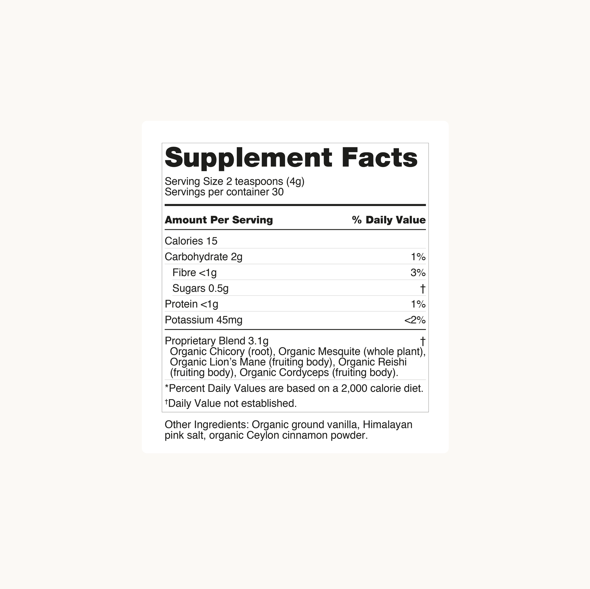 - Includes Lion’s Mane for cognitive clarity and focus, Reishi for calm and balance, Cordyceps for energy and stamina, plus chicory for prebiotic support and mesquite for minerals and natural flavour.